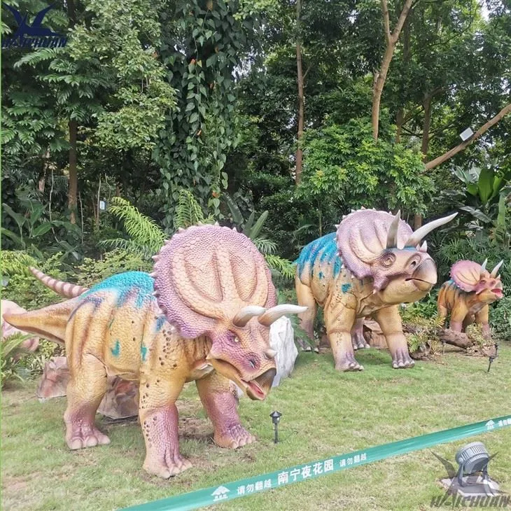 Dette er en gruppe Triceratops-skulpturer, du kan tydelig se det komplekse mønsteret til Triceratops kroppsoverflate, som er håndlaget av arbeidere. Ulike deler har forskjellige linjer, og selv om dinosauren er laget av svamp, kan du se disse hudlinjene som den harde ytre huden til dinosauren.